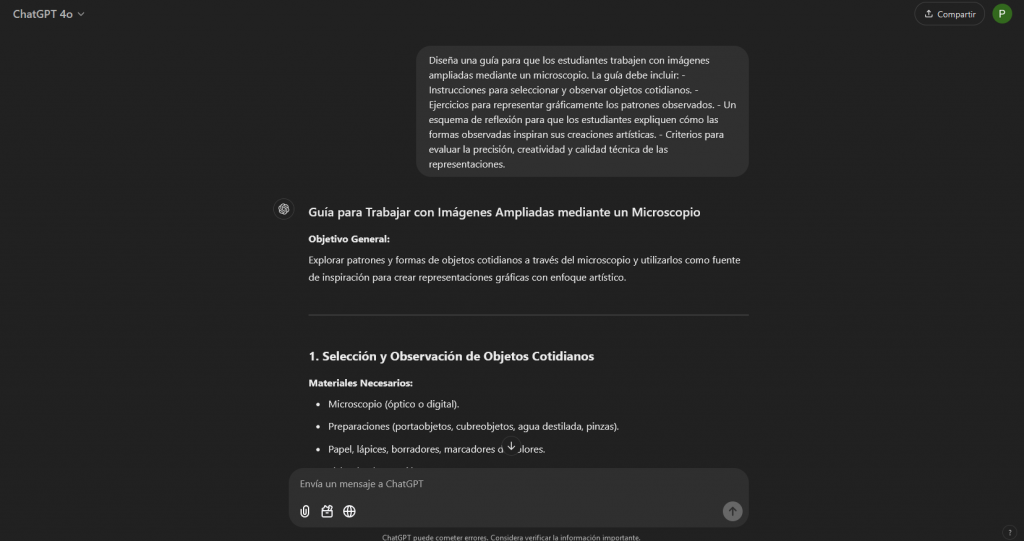 Diseña una guía para que los estudiantes trabajen con imágenes ampliadas mediante un microscopio. La guía debe incluir: - Instrucciones para seleccionar y observar objetos cotidianos. - Ejercicios para representar gráficamente los patrones observados. - Un esquema de reflexión para que los estudiantes expliquen cómo las formas observadas inspiran sus creaciones artísticas. - Criterios para evaluar la precisión, creatividad y calidad técnica de las representaciones.