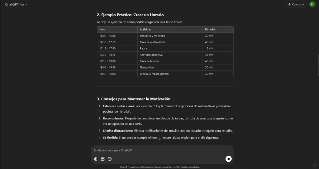 - Formato preferido: Prefiero explicaciones escritas acompañadas de plantillas para crear horarios.