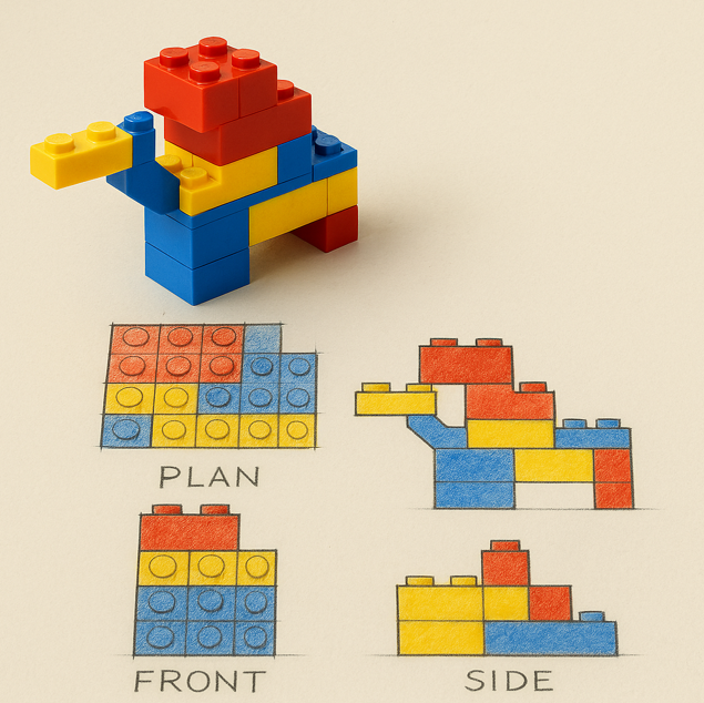 Construís una figura con LEGO y dibujáis su planta, alzado y perfil. Así mejoráis la visión espacial y la representación técnica